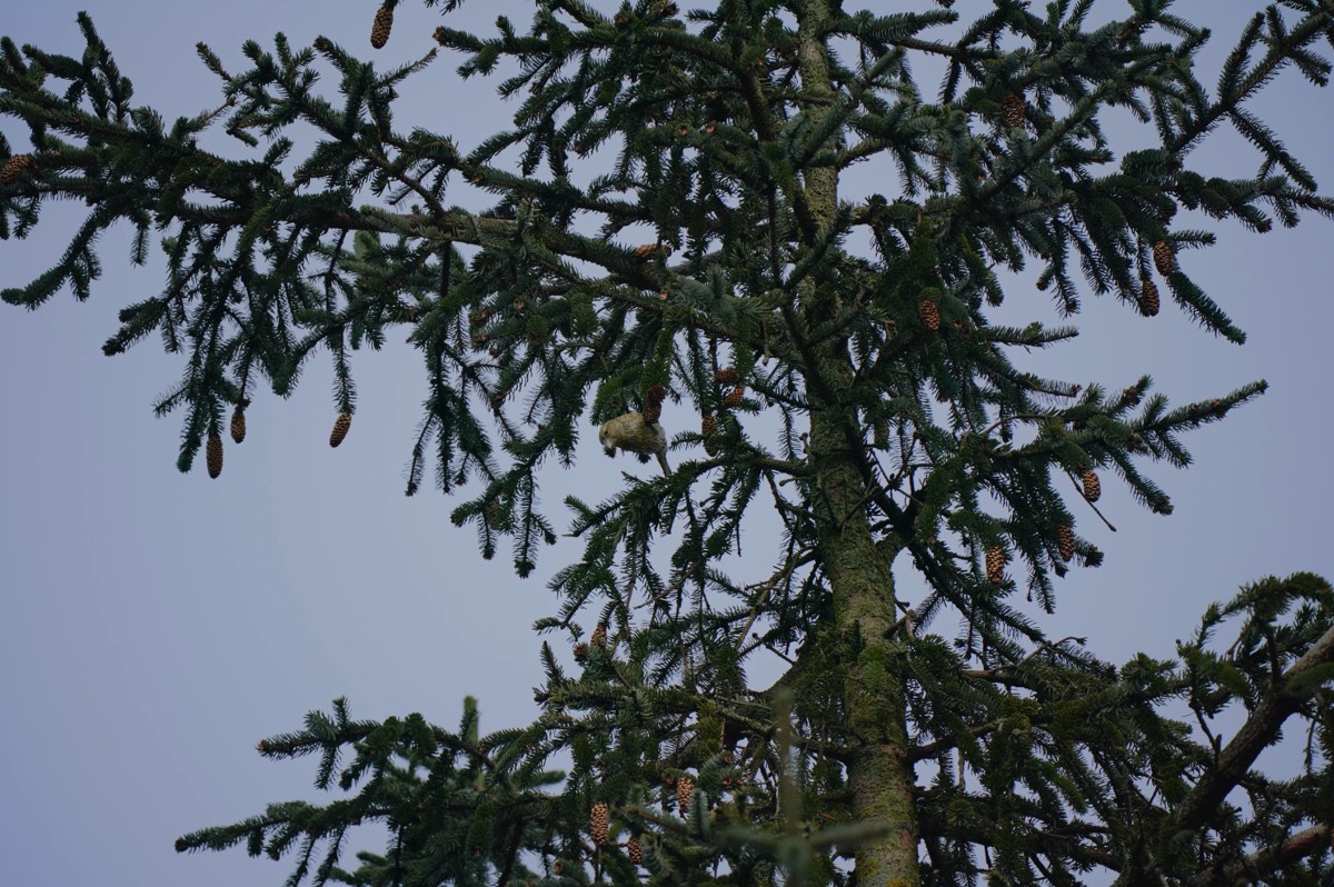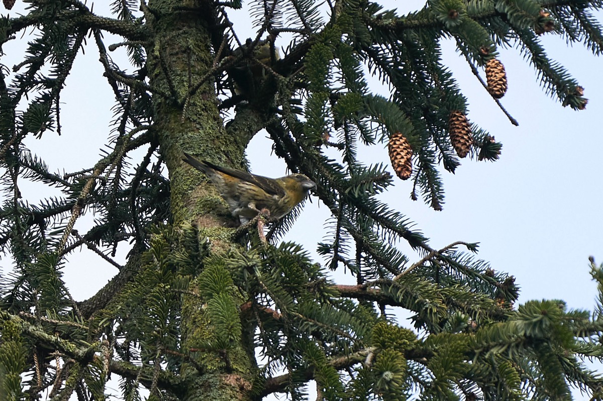 After a couple of hours we decided to leave the car and walk through the forest towards another viewpoint deep in the forest. As we approach the well-known car park, we could hear crossbills chattering above us. After a few minutes we got our eye in and started to see well camouflaged birds above our heads, very high in the trees. Don't judge the photograph too harshly, I was having a bad day with the camera.